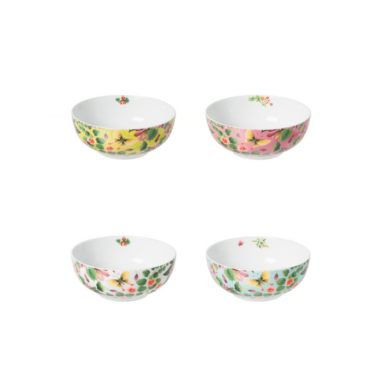 This stunning set of cereal/soup bowls showcases the vibrant Ikebana floral design, adding a splash of colour and pattern to your dining table. The set is beautifully packaged in a decorative gift box with four distinct colour-ways. It is part of a luxurious collection of contemporary porcelain tableware. Dishwasher and microwave safe. 16cm diameter.